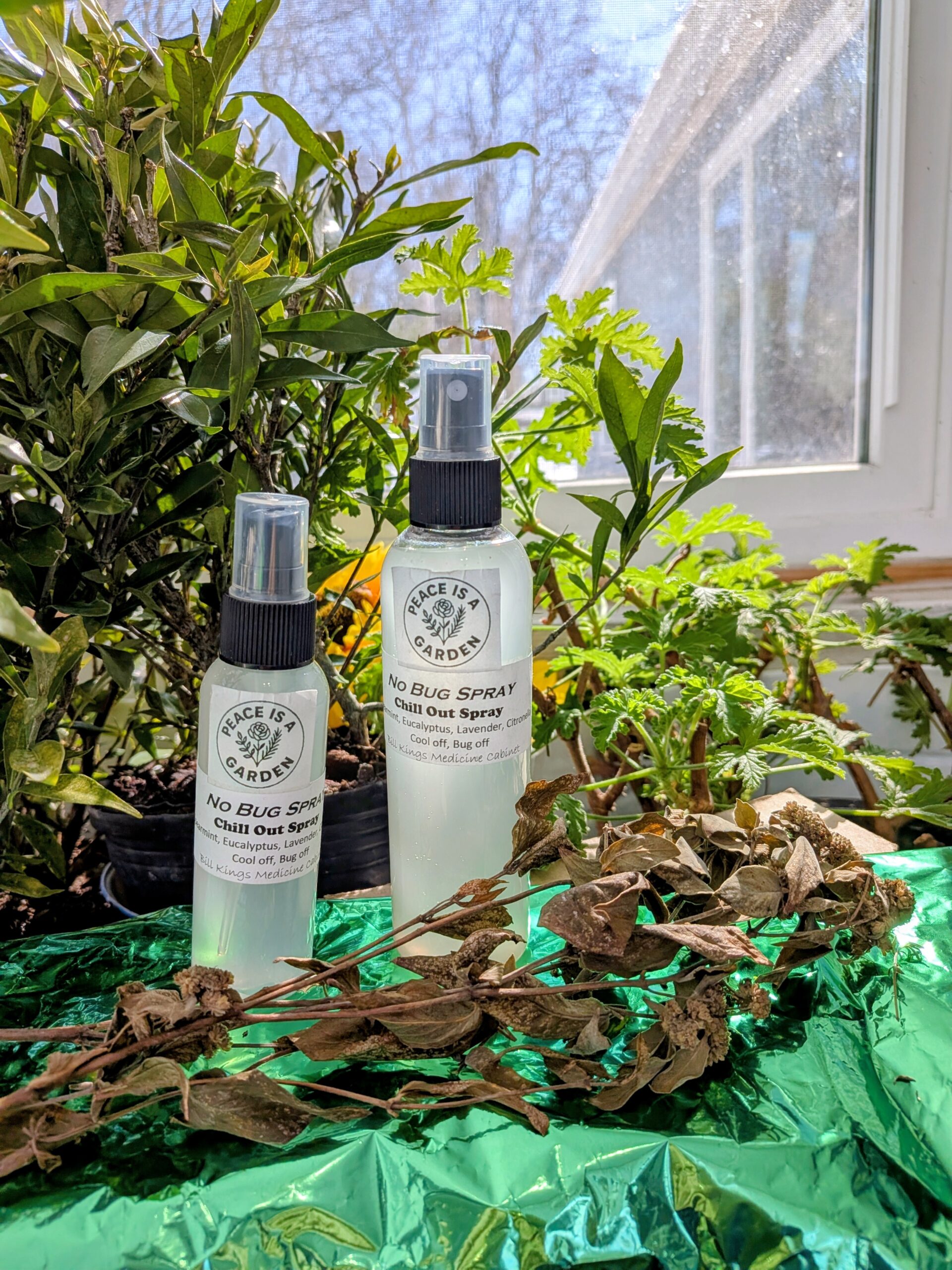 Insect repellants don’t have to smell and feel like chemistry, the Chill Out! spray feels fresh and smells minty, but mosquitos don’t like mint.ย Spearmint, Mint and Rosemary Hydrosols with Citronella, Mint, and Eucalyptus essential oils.ย Pretty good mosquito, gnat and fly repellant with cool feel and minty scent.ย Can keep reapplying, since it’s only the mint, no chemicals.