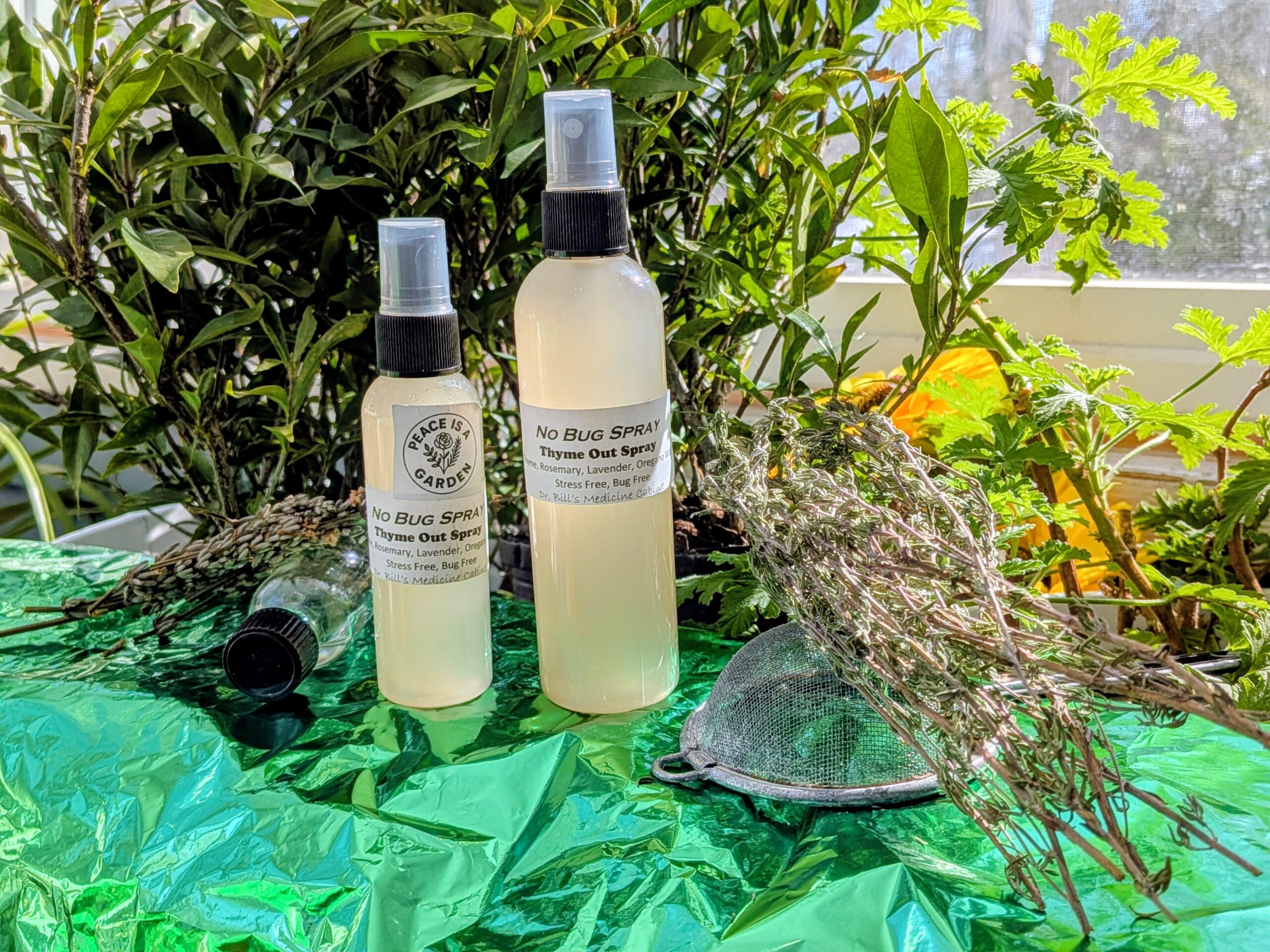 Thyme, Rosemary & Oregano Hydrosols (floral waters and teas) with Citronella and the herbs essential oils.ย Uses the floral waters, so you don’t smell like spaghetti sauce.ย Has a more earthy scent to go with your outdoorsy vibe.ย Good for repelling mosquitoes and gnats, not sure about fleas and ticks.ย Look at the Sock it to YA spray.
